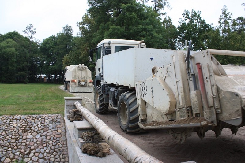 Прикатка обрабатываемого слоя грунта осуществляется катком на пневматических шинах, либо вибрационным (осцилляционным) гладковальцовым катком с отключенным режимом вибрации (осцилляции) до плотности 0,85-0,90 от максимальной по методу стандартного уплотнения;