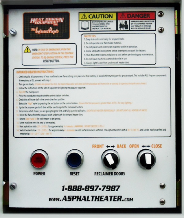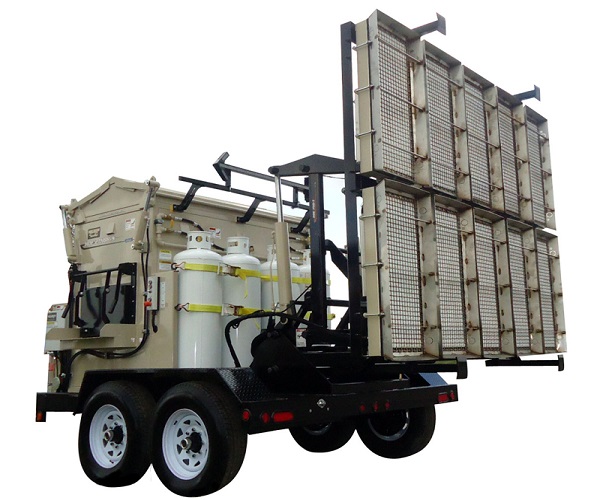 Установка является не заменимой для подрядчиков и прекрасно используется в паре с инфракрасными обогревателями, расположенными на трейлере. Его простота в управлении и эксплуатации и обеспечивает достаточную пропускную способность для многообразных ремонтов покрытий. Панель нагрева - 2.4 м x 1.83m (нагреватель несущей рамы, изготовленные из 3" x 3" из уголка)